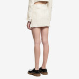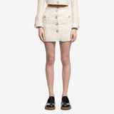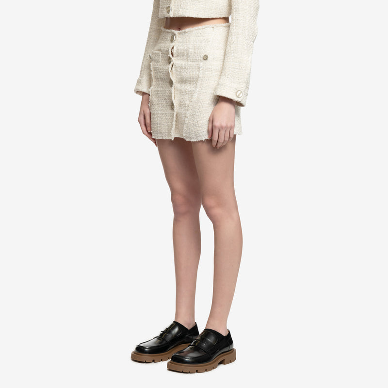 Constructed with a cotton-blend tweed fabric, this ladies' mini skirt boasts a feminine silhouette and eye-catching sequin embellishments. The front features a closure with nacre buttons adorned with the merchant's logo in a tone-on-tone design.