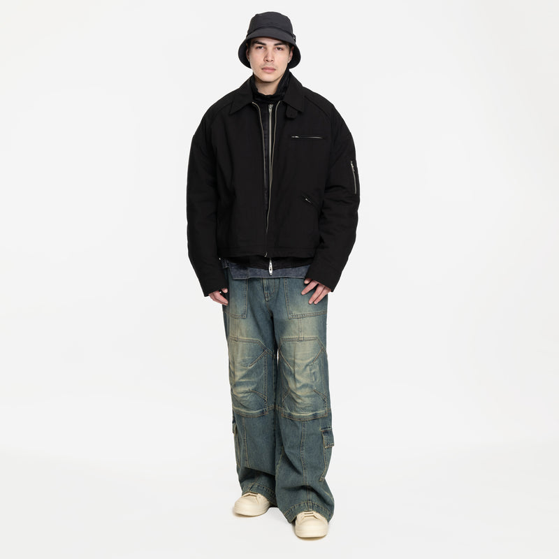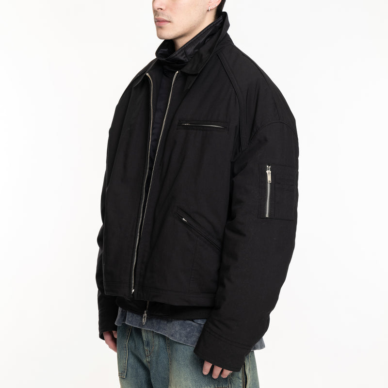 This bomber jacket is made of insulated nylon canvas, providing both warmth and durability. Constructed of 100% Nylon Fill and a 100% Polyester Trim, with a 100% Nylon Lining on the first layer and a 95% Polyester, 5% Polyurethane Lining on the second layer. Featuring a front zipper closure, front zipper pockets, layered and paneled construction, and an inner layer with elastic hem. Other details include a press-stud closure at the stand collar, bungee-style drawstring at the hem, and cinch tab at the side seams. Raglan sleeves add to the jacket's utility, along with a sleeve utility pocket and logo flag. Adjustable press-stud barrel cuffs and a logo patch at the interior complete the look. Made in Korea with expert craftsmanship.