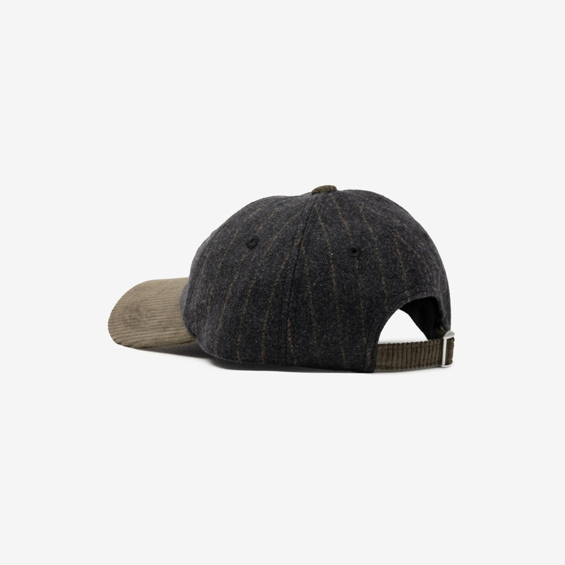This grey corduroy baseball hat features a metal buckle with an engraved 'Drôle' and an adjustable strap, complete with 'Drôle' embroidery on the front and tennis stripes for added flair.