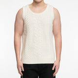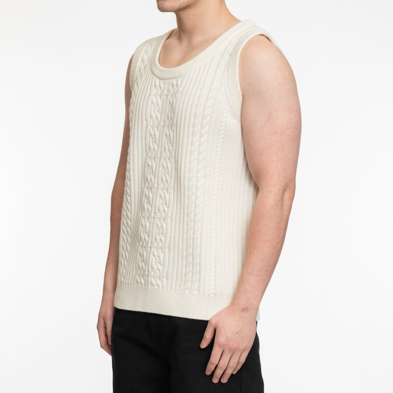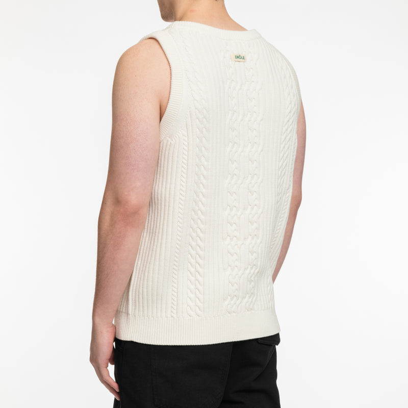 This cable knit vest is made of a blend of cream cotton and wool, with ribbed edges and a round neckline. The back is adorned with a 'Drôle' chevron label.