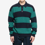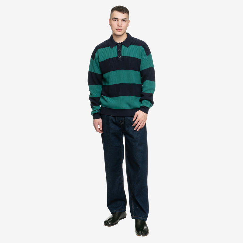 The Drôle de Monsieur Le Polo Piqué Rayé in navy showcases a bold green stripe pattern with a textured piqué knit. Designed with a classic collar and button placket, it blends preppy and casual influences for a modern yet nostalgic look. Pair it with denim or tailored trousers for effortless style.