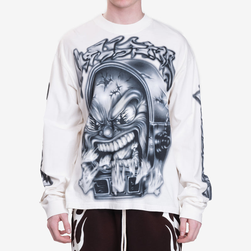 The Hellstar Mark Long Sleeve T-Shirt delivers bold streetwear vibes with its striking airbrush-style graphics and "Mark 8:36" text. Crafted from premium cotton in a neutral cream tone, this shirt combines comfort and edgy design. Perfect for urban fashion enthusiasts looking to make a statement.