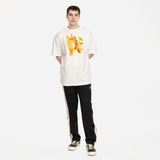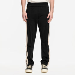 Discover a modern interpretation of a classic piece of clothing. These men's track pants feature a sleek black design with an elastic waistband, stylish ecru side bands, and convenient ankle zippers. With vertical pockets on the front and a black embroidered monogram below the left pocket, these pants are the perfect combination of function and style.