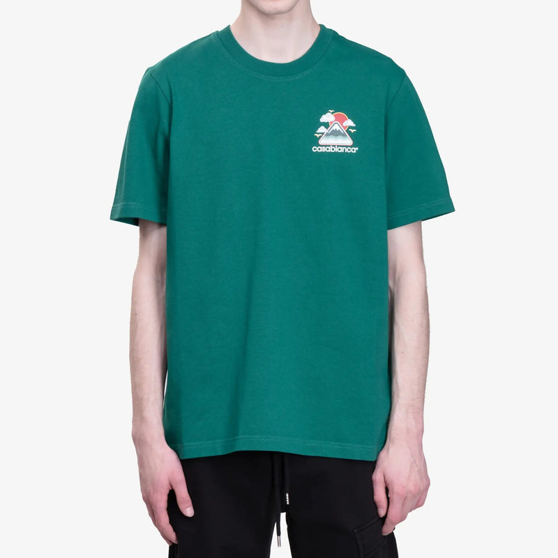 The Casablanca Montagne Ondulée T-Shirt is crafted from soft green cotton and showcases a mountain and sunset graphic with a retro-inspired vibe. Featuring a small chest print and a larger back design, this relaxed-fit tee captures Casablanca’s signature fusion of sporty elegance and vibrant artistry.
