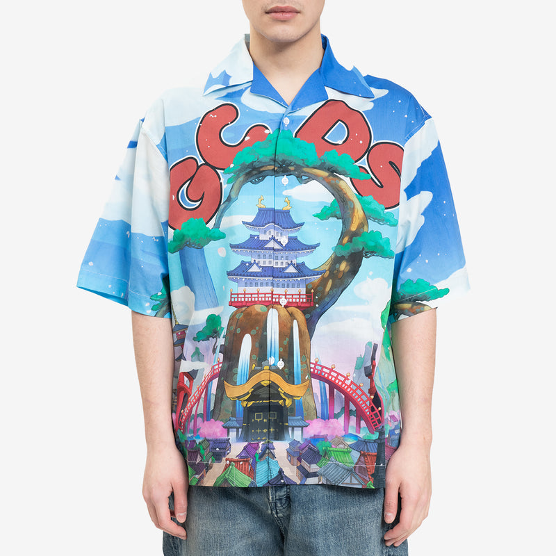 The GCDS x One Piece Bowling Shirt merges anime aesthetics with streetwear flair. Featuring a vibrant all-over print inspired by the One Piece universe, it showcases bold colors, a relaxed fit, and a camp collar for effortless styling. Crafted from lightweight fabric, this statement piece is perfect for fans and fashion enthusiasts alike.