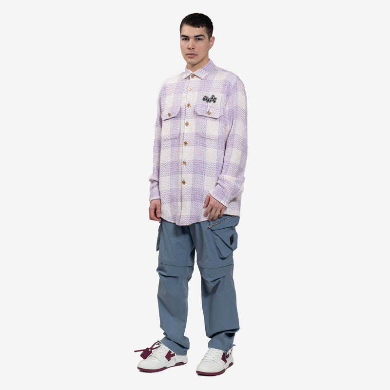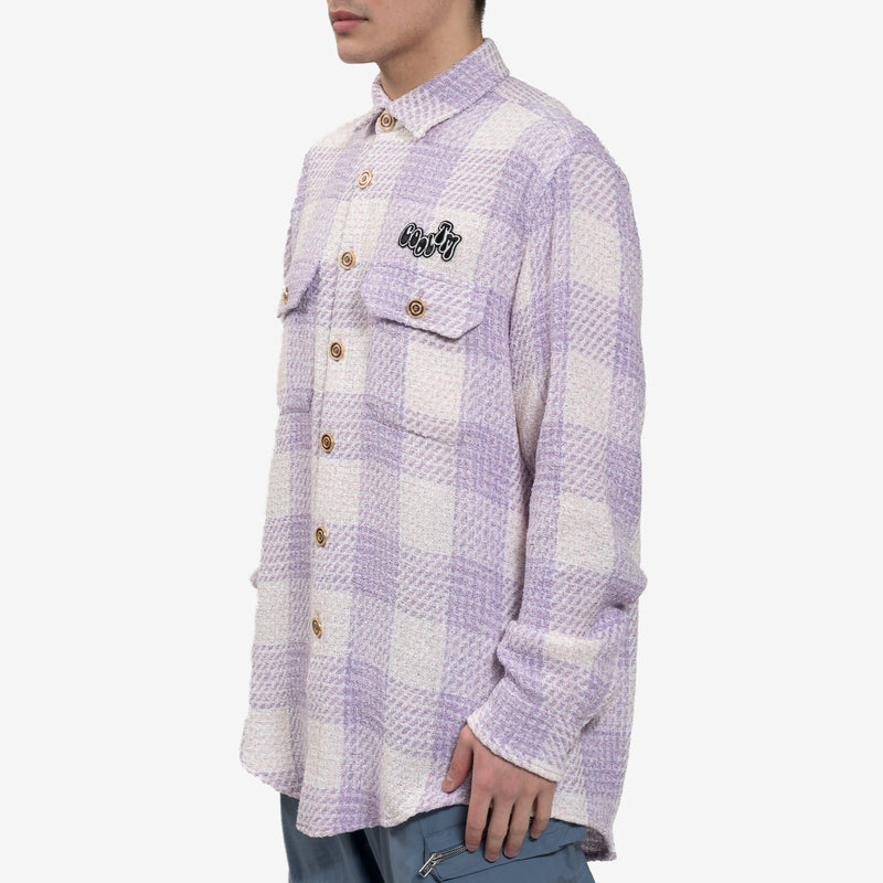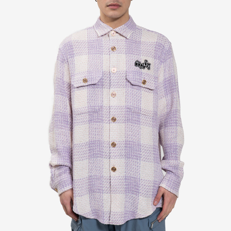 The Oversized Tweed Shirt has a "COOL TM" embroidery logo on the chest and features a front button enclosure, two chest welt pockets, COOL TM signature buttons, cuff button enclosure, and a curved hem. Made in Romania, it is composed of 37% Cotton, 30% Polyester, 19% Polyamide, 11% Viscose, and 3% Acrylic.