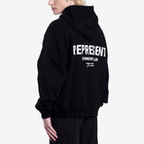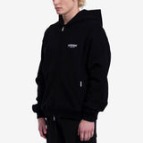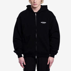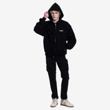 This black hoodie features a classic zip-up design and a spacious hood, perfect for layering. The front showcases a sleek logo, while the back makes a bold statement with large text detailing. Made from soft, high-quality fabric, it offers both comfort and durability.