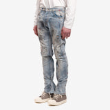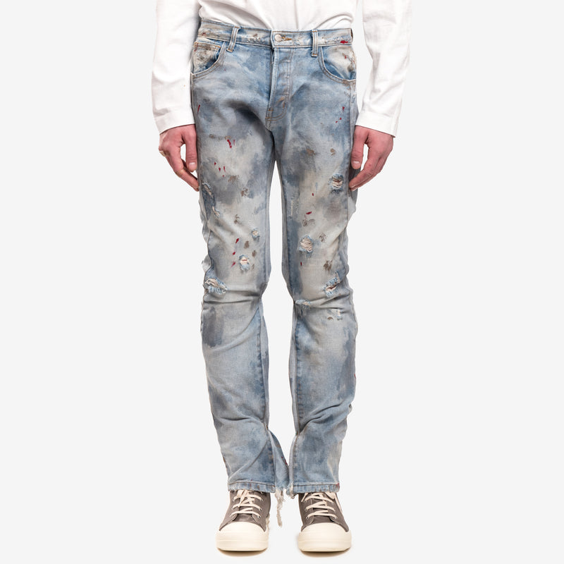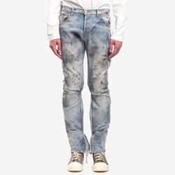 The RRR123 Painted Repented Pants redefine distressed denim with an artfully worn-in aesthetic. Crafted from faded blue denim, they feature paint splatters, frayed hems, and heavy distressing for a raw, lived-in feel. A slim-straight fit and classic five-pocket design balance rugged texture with effortless wearability.