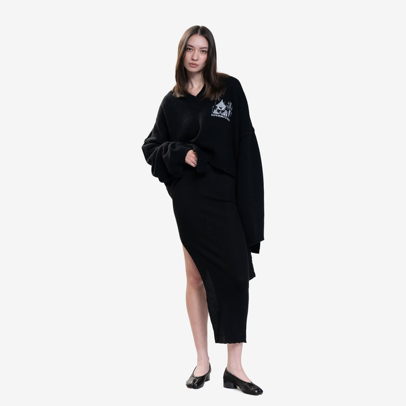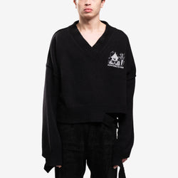 Knitted sweater with exaggerated sleeves and a cropped body.