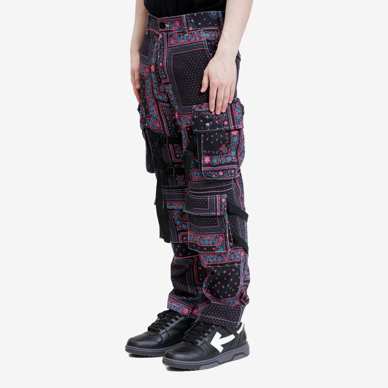 Crafted from 100% CO, the Pink Paisley Bondage Pants from ROGIC feature a button and belt loop waist, side pockets, snap button flap closure cargo pockets, and bondage straps. Perfect for adding a touch of style to your wardrobe, these pants are a must-have for any fashion-forward individual. Imported for quality and durability.