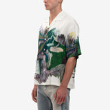 This short-sleeve button shirt has a bowling collar and features printed artwork of an original Domrebel painting. The comfortable twill fabric is meticulously cut and sewn to ensure print alignment throughout. The shirt is also detailed with mother-of-pearl buttons. It has a relaxed fit and is true to size.