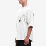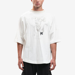 This product features a unique design, incorporating themes from the artist's own imagination. The shirt is crafted in classic white and showcases a woman with a bird portrait, along with a printed motto. The front design is sealed with an embossed print, while the back displays the black Monogram seal and the Palm Angels logo printed in black on the shoulders.