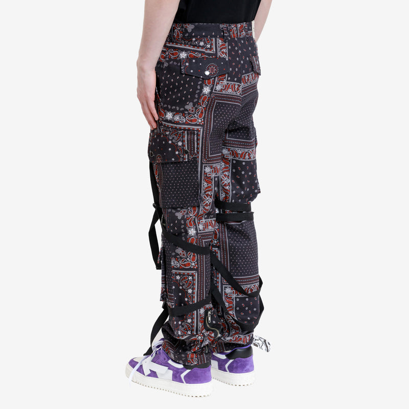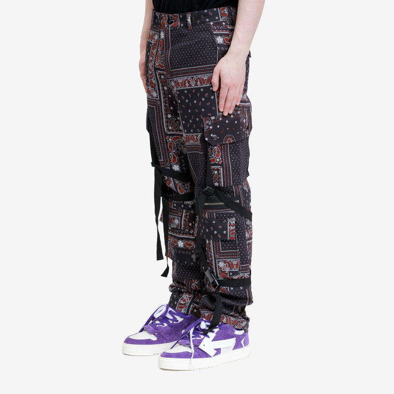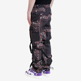 The Rogic Red Paisley Bondage Pants feature a button and belt loop waist, as well as side pockets and snap button flap closure cargo pockets. The pants also include bondage straps and are made of 100% CO. This item is imported for your convenience.