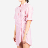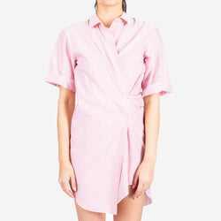 The Unravel Project Women's Red Stripe Draped Shirt Dress in 100% Cotton, crafted in Italy, effortlessly merges classic and contemporary style. Featuring a flattering asymmetrical drape and soft red pinstripes, it offers a chic, relaxed silhouette with rolled short sleeves and subtle detailing. Perfect for versatile styling.