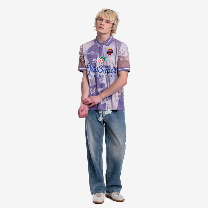 The KidSuper Cream Ronaldinho Soccer Jersey honors the football legend with a vintage cream and lavender style. Sporting Ronaldinho's famous number 10 on the back, this jersey seamlessly combines streetwear and athletic flair, making it ideal for both the field and casual wear.