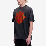 This black Saint Michael x Denim Tears t-shirt features a bold red and yellow star graphic with "Saint Tears" on the front. The back showcases a statement text design reading "Sickening Ceremony," adding a rebellious and artistic touch.