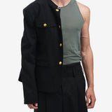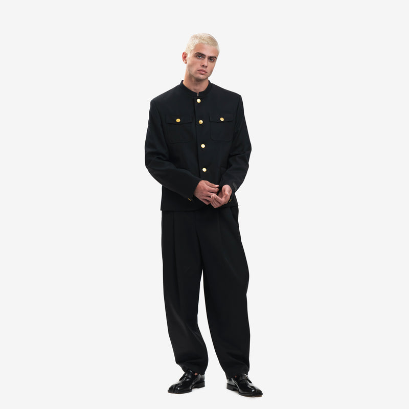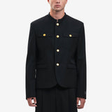 This tailored jacket inspired by Japanese school boy uniforms features a removable KENZO Paris label on the cuff and elegant Boke Flower gold buttons. The inside also includes a KENZO metal chain and a pack of 4 rings for blocking the buttons in case the chain is removed. The jacket is finished with a contrasting lining and a hook and eye closure at the collar.
