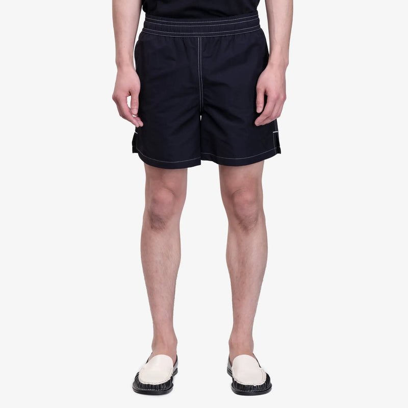The Ami Paris Short de Bain Beach Shorts are crafted from lightweight technical fabric in classic black. Featuring an elasticated waistband, contrast white stitching, and side pockets for functionality. Finished with a subtle tonal Ami de Coeur logo at the hem, these shorts offer a clean, sporty look.