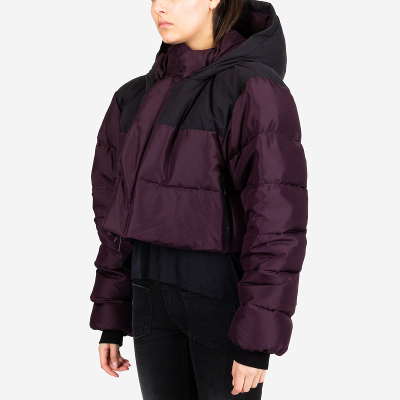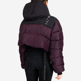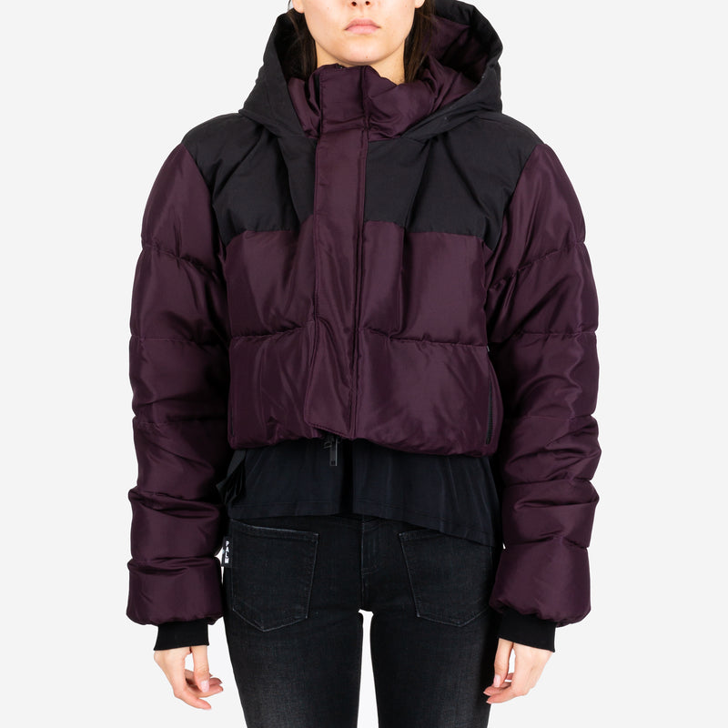 Unravel Project Women's Silk Habotai Cropped Down Jacket. Crafted in 100% luxurious silk, this Italian-made cropped puffer jacket combines warmth with high-fashion. Featuring a stylish color block design in rich plum and black, it's a bold statement piece for colder days.