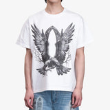 The Who Decides War Soaring Window T-Shirt features a dramatic winged dove graphic framed by gothic window arches and bare branches. Cut from heavyweight white cotton in a relaxed silhouette, it channels a spiritual tone with signature artistic detail and visual depth.