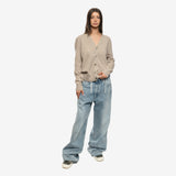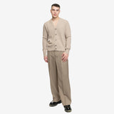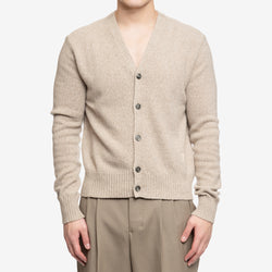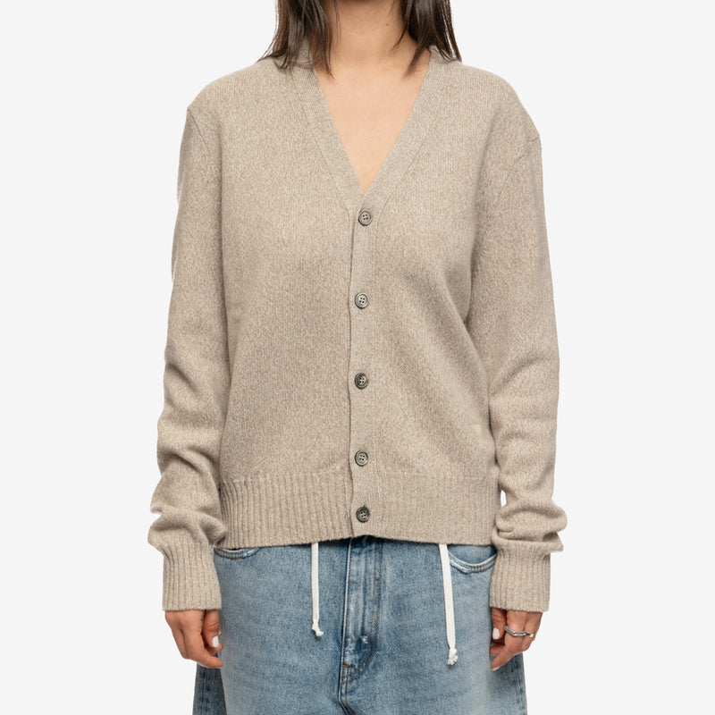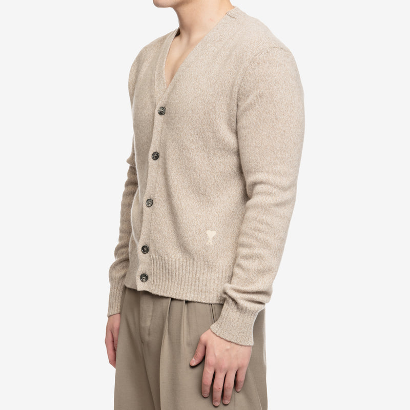 The Ami Paris Tonal Ami de Coeur Cardigan is crafted from a premium wool blend in a soft beige hue. Featuring a minimalist tonal embroidered Ami de Coeur logo, ribbed cuffs and hem, and a classic V-neck with button closure, this cardigan blends quiet luxury with timeless Parisian tailoring.