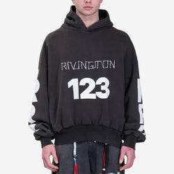 The RRR123 Hoodie merges statement graphics with a relaxed, oversized silhouette. Crafted from heavyweight cotton, it features bold "RAVINGTON 123" lettering across the front and oversized "RRR" branding down the sleeves. Ribbed cuffs and hem add structure, while dropped shoulders enhance its laid-back appeal.