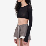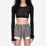 This long sleeve crop top maintains a slim fit and features a round neck, raw cut hem and cuffs, and the signature single seam running down the center back spine. It is designed to be above-waist length.