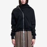 The Rick Owens Women's Mountain Hoodie offers a bold, modern silhouette with its signature asymmetrical zip closure and oversized hood. Crafted from high-quality cotton, this versatile black hoodie delivers both comfort and style. Ideal for layering, it reflects Rick Owens' unique fusion of streetwear and luxury.