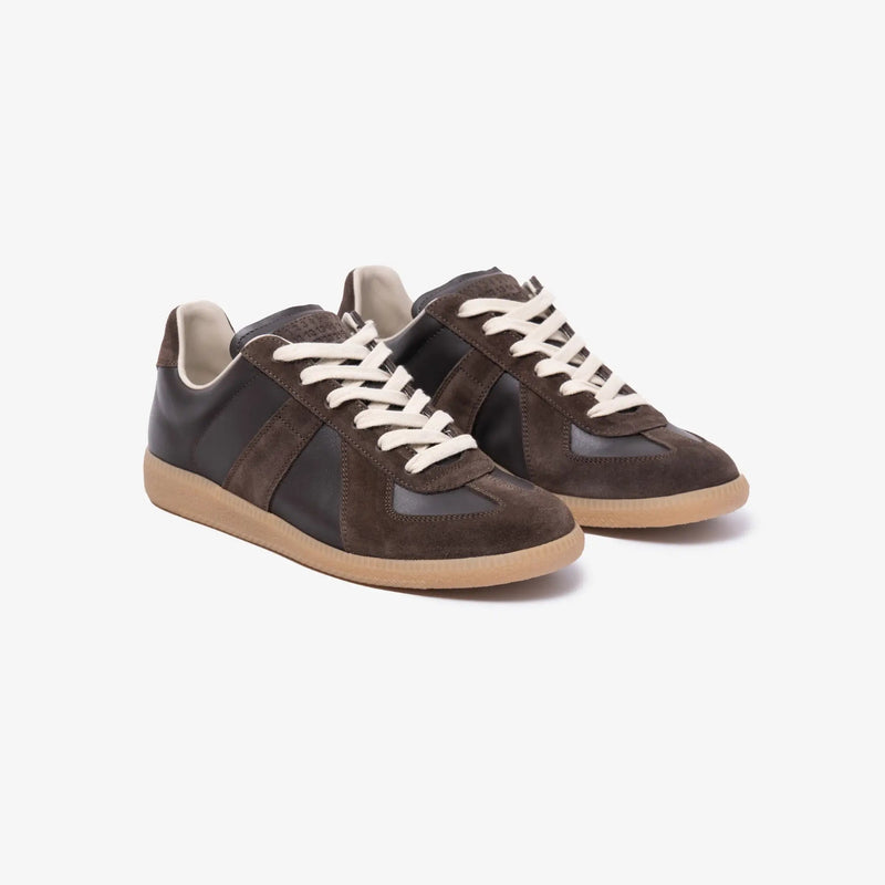 Margiela’s cult Replica arrives in dark khaki: paneled leather and suede uppers, cream laces and a classic gum cupsole. Finished with the house’s four white heel stitches. Italian-made, fully lined and endlessly versatile—dress them up or down with equal ease.